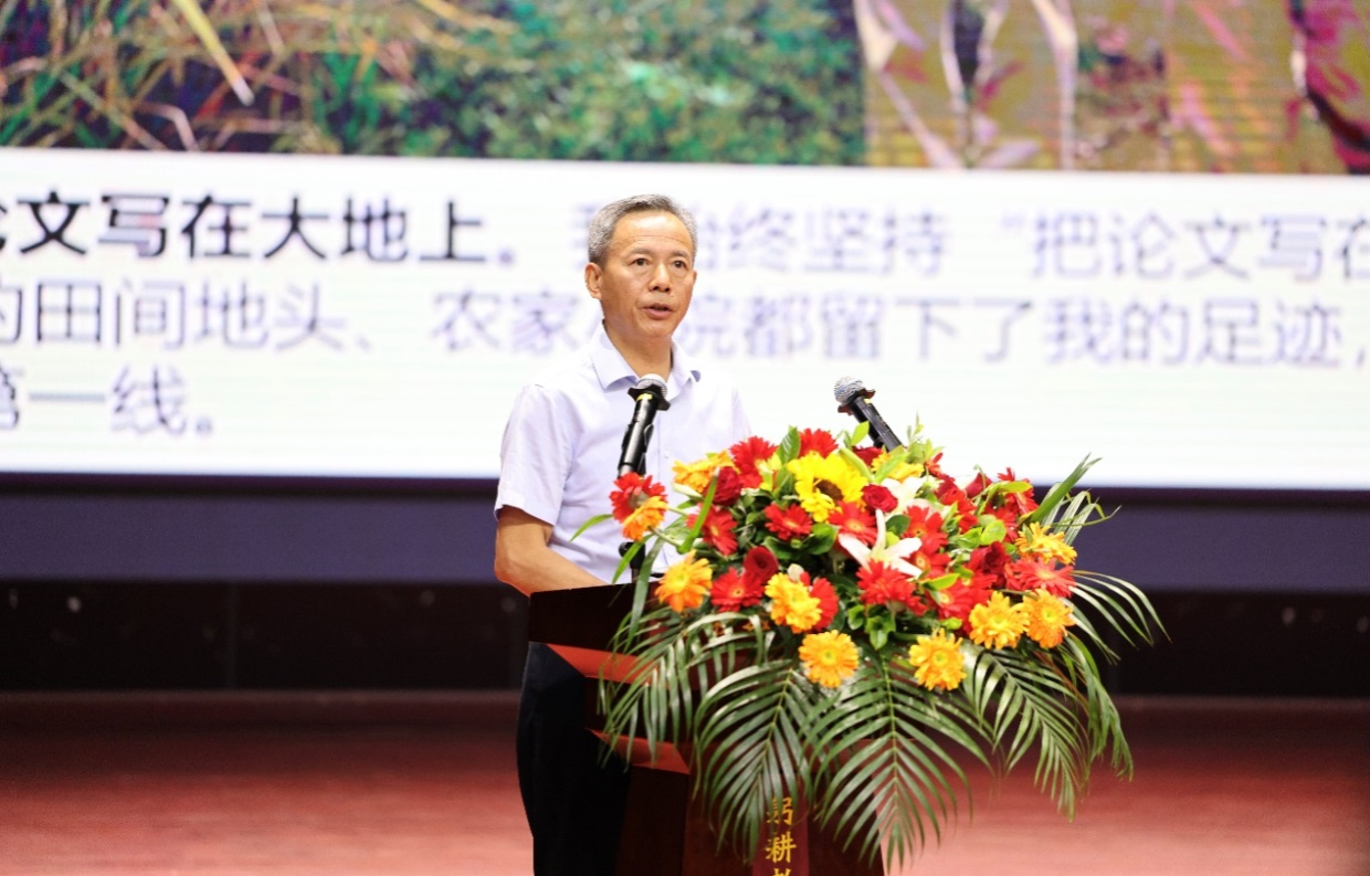 马均教授以“把‘川农大精神’装在心坎里,把论文写在大地上”为题,讲述了自己37年坚守专业的故事。他从三方面与大家进行了分享:一是把“川农大精神”装在心坎里。从进入四川农业大学的校门,就深受经过数代川农人的薪火传承和不懈努力形成的“川农大精神”的深深感染和教育,老师们的言传身教为他一生的成长奠定了坚实基础。二是把人才培养融入作物栽培事业。接过老师们的教鞭,一直秉承“为了大地的丰收,坚持把论文写在大地上,才能培育优秀的专业人才”的理念,即使在上世纪90年代末期,作物栽培学领域经费极其紧张、大量人才流失,他一度成为水稻所作物栽培方向的“独苗”,但他毫不动摇,仍默默坚持研究,并在教书育人过程中,常把作物栽培和人才培养相提并论,以前辈大家为榜样勉励学生热爱专业,更以实际行动展示出这种热爱。他培养毕业的学生走出校门后都成为了大专院校、科研院所和农业技术推广单位的骨干。三是始终坚持把论文写在大地上。带领团队深入田间地头攻克难点,主持或主研完成的13项研究成果先后获得了国家和省部级科技奖励,取得了显著社会经济效益。这种将科研设在农村、长期扎根基层的做法和精神得到了各级领导和专家们的高度赞扬。特别是2022年6月8日,习近平总书记视察了马均教授及其团队在眉山东坡永丰建立的水稻新品种新技术中试基地。他向总书记介绍了基地建设、教书育人和技术推广情况,得到总书记的充分肯定。