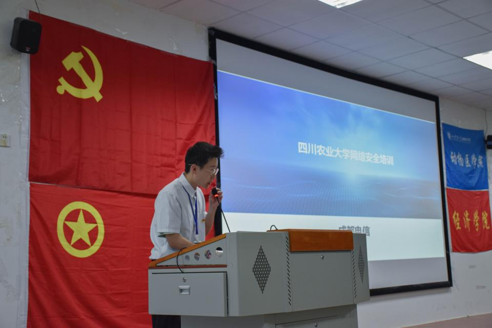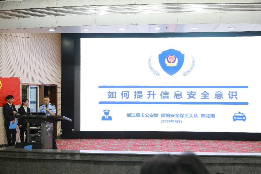 图为都江堰市公安局韩龙雨警官提升信息安全意识讲座