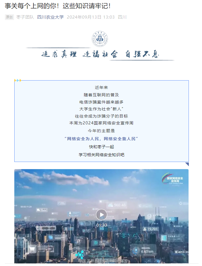 9月9日至15日是国家网络安全宣传周,今年的主题为:“网络安全为人民,网络安全靠人民”。为了全面提升全校师生的网络安全意识,共筑信息安全长城,守护和谐清朗家园,学校精心策划组织了一系列丰富多彩、形式多样、线上线下结合的宣传教育活动。