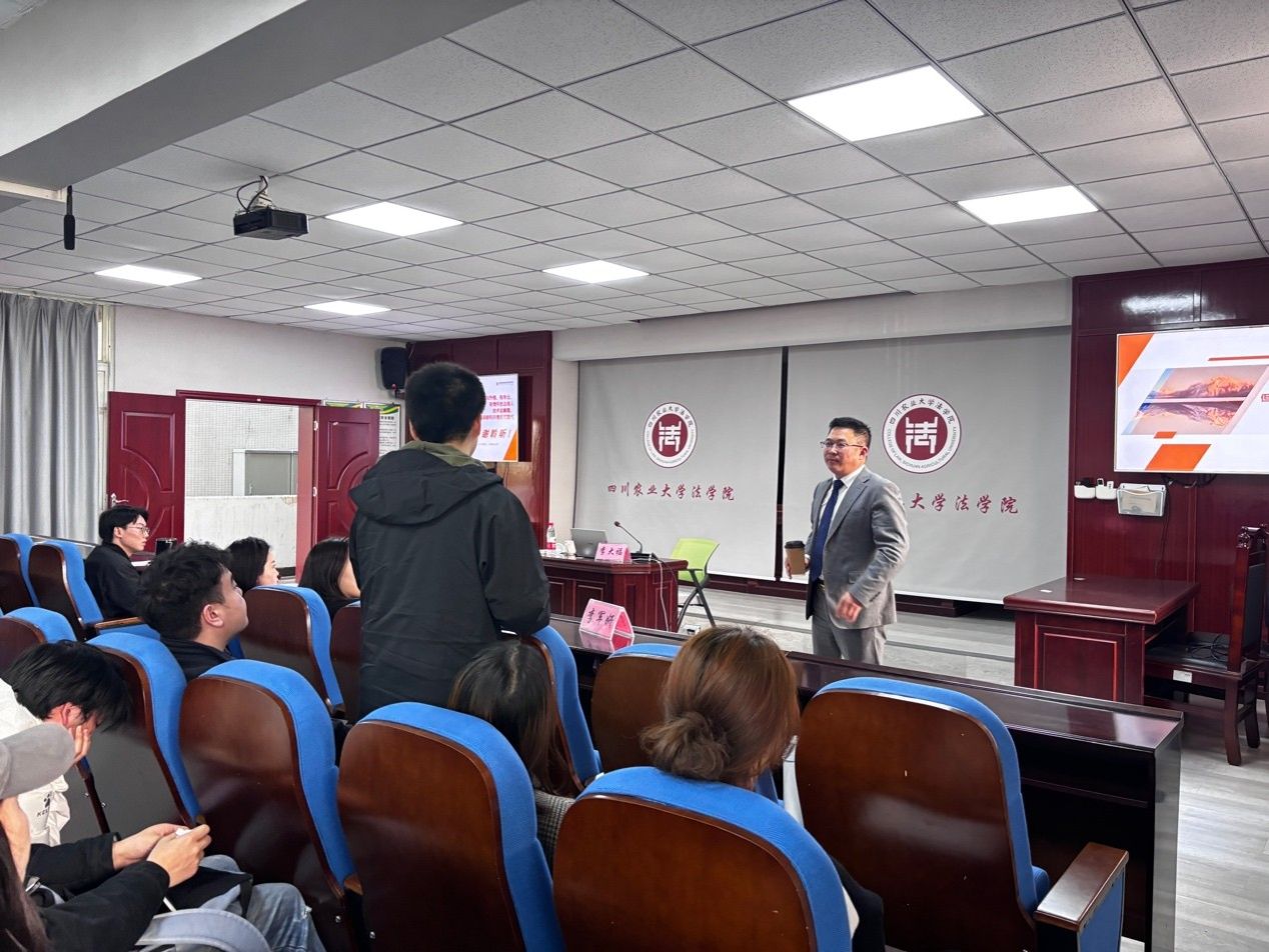 3月25日,法学院特别邀请成都市人大代表、民进成都市委会常委、省律协环资能专委会副主任兼国企外部董事,法学院硕士研究生校外导师、四川恒和信律师事务所高级合伙人管委会副主任李大福律师做客法律实务大讲堂,以《法律人的未来——从“专业能力”到“职业生态”的进阶之路》为题作了首场讲座。讲座由法学院党委副书记、纪委书记、副院长唐薇主持,法学院2024级研究生及部分本科生聆听了讲座。