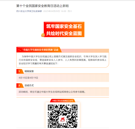 利用线上线下多种形式开展宣传活动。一是精心制作宣传展板,悬挂横幅,吸引师生关注国家安全教育活动。二是开展“全国大学生国家安全知识答题”和“国家安全教育日主题作品征集与展示”线上答题活动,全校1000余名学生参与,活动反响强烈。三是通过微信公众号推送国家安全主题教育图文资料,营造了师生学国家安全、讲国家安全、维护国家安全的浓厚氛围。