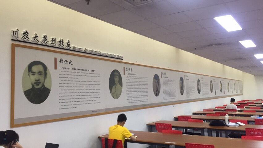 该文化墙以“川农大精神”为设计主题,在一楼大厅正墙面便直切主题,以川农大景观元素及川农人在艰苦环境下认真教学科研的剪影图为背景,衬托出“爱国敬业、艰苦奋斗、团结拼搏、求实务新”的“川农大精神”十六字概括表述。三层楼的主题文化墙面元素设计上各有侧重,一楼墙面设计以上世纪校园老照片、改革开放以来我校取得的重大成果及“川农大精神”正式命名的文献档案复印件为主;二楼文化墙则着重展示了12名川农大英烈校友的大幅人物肖像及英勇事迹;三楼文化墙则以我校“三杨精神”为主要展示内容,叙述了杨开渠教授、杨允奎教授、杨凤教授的生平经历、科研成果及他们朴实无华、严谨认真、脚踏实地、勇攀高峰的科研精神。