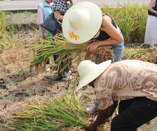 同学们首先来到了川农牛稻米种植基地。据成都现代农业产研院工作人员张可介绍:目前基地主要培育的品种为“川农牛红香糯”,具有自带天然香味、富含花青素糯性优、米质口感上佳等特点。随后,在沈倩岭教授的带领下,同学们戴上草帽,拿起镰刀,下到稻田里亲身体验稻米的收割过程,一同分享丰收的喜悦。来自加蓬的李安德同学感叹道:“这是我第一次见到红色的稻谷,更是我第一次亲手收割稻谷,一想到我收割的稻谷将来也会变成碗里的米饭,我感到非常神奇与幸福!”
