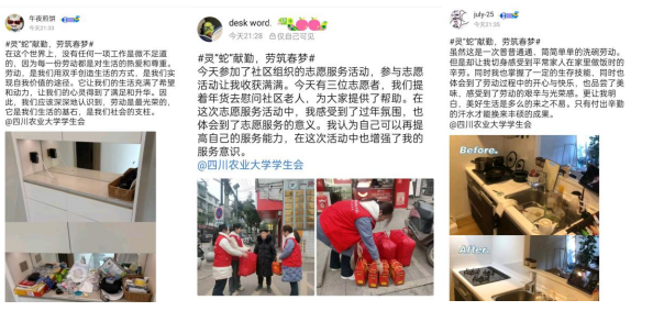 “灵‘蛇’献勤,劳筑春梦”主题活动以“家务活动+志愿服务”双线模式开展,引导青年学子在实践中感悟劳动价值,传递社会温暖。在家务劳动打卡中,同学们主动承担家庭责任,用照片和视频记录家务劳动瞬间。在志愿服务打卡中,同学们化身温暖使者,参与社区关爱活动、环保行动等。商旅学院张杨带领团队深入社区为老人送去新春祝福,为老人打扫房间、张贴春联。受助老人拉着他的手连声道谢:“谢谢你们,你们一来,家里热闹多了,连窗花都透着喜气!”