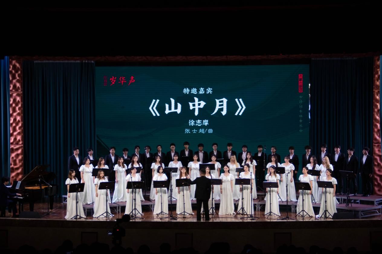 特邀嘉宾成都师范学院音乐学院蓉城之声合唱团带来混声合唱《山中月》和《世界赠予我的》,音乐会在唐代山水田园诗人孟浩然的名作《舟中晓望》中落下帷幕。
